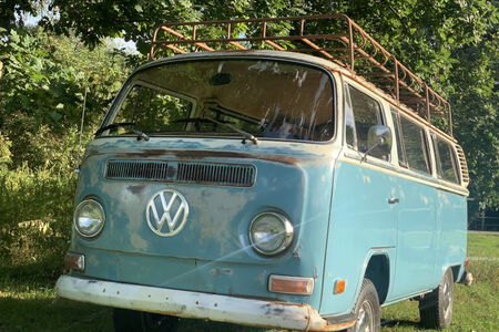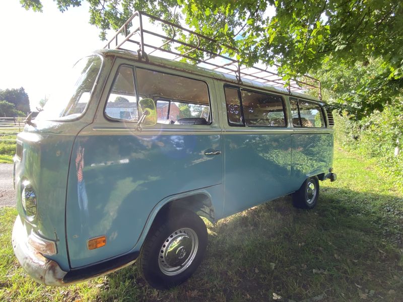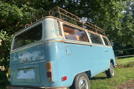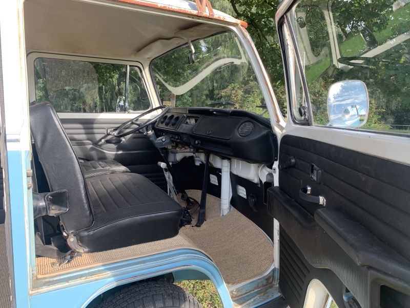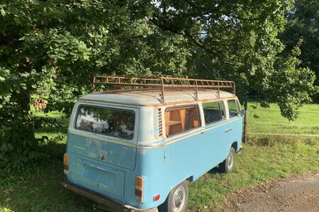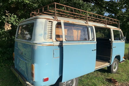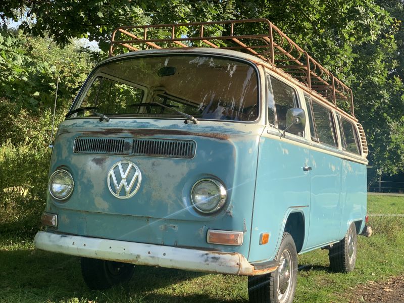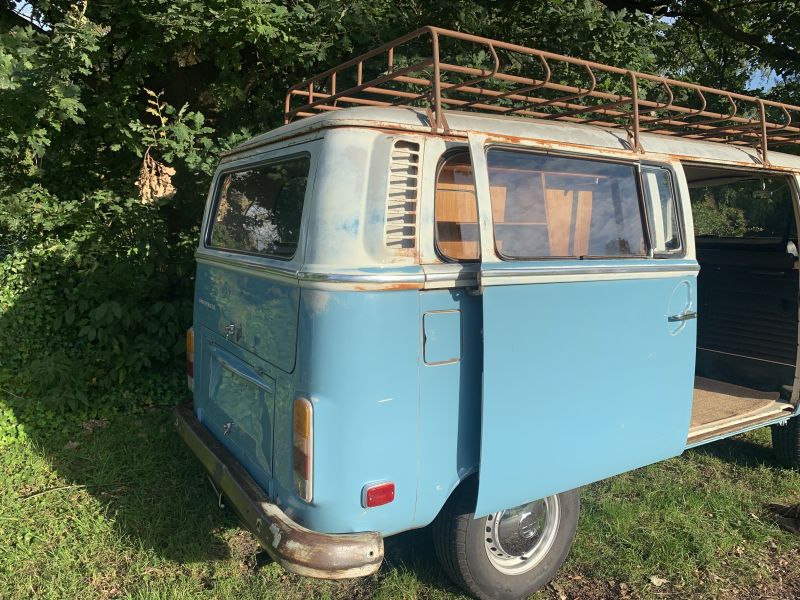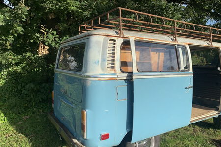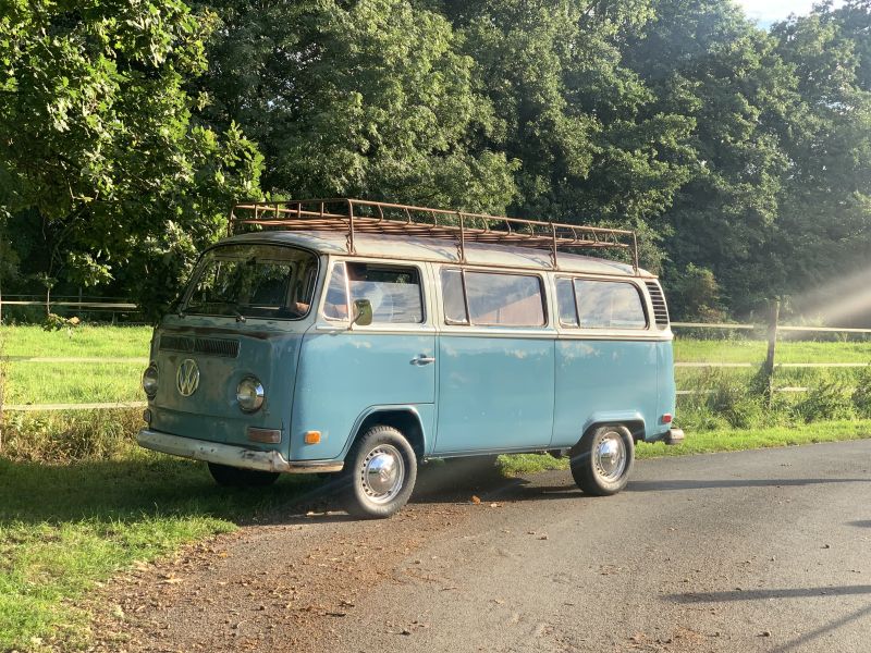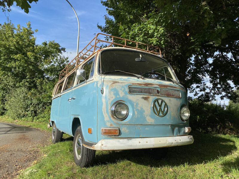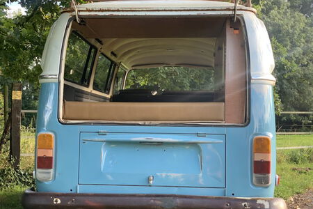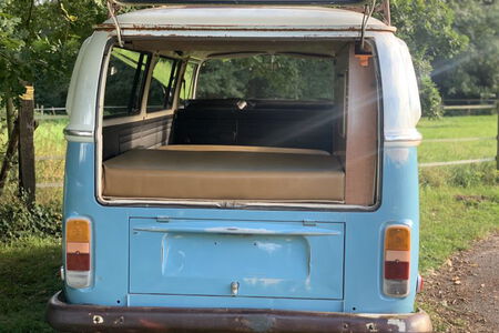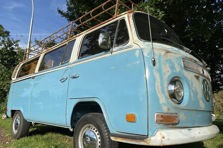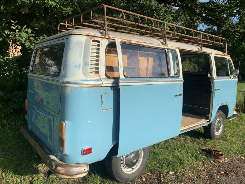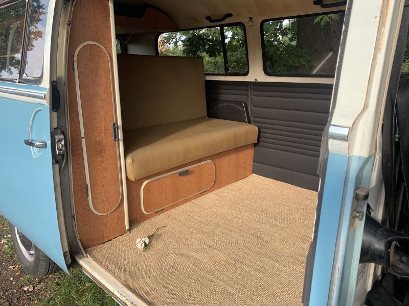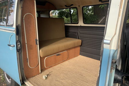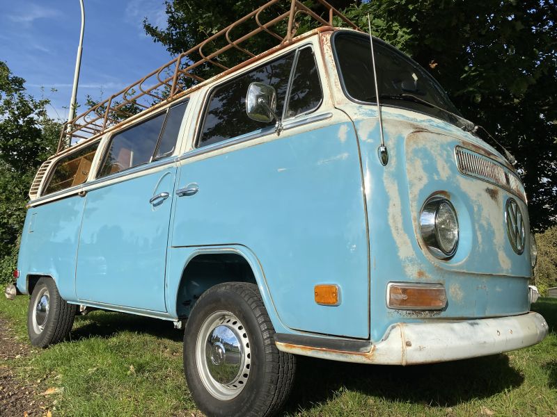 Angeboten wird ein 1972er VW T2ab Deluxe Bus im Erstlack Niagarablau-Pastellweiß mit Westfalia Weekender Ausbau und Schlafbettfunktion.