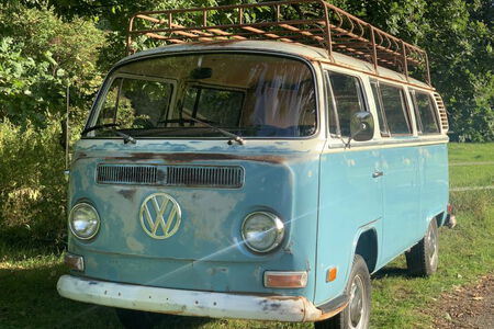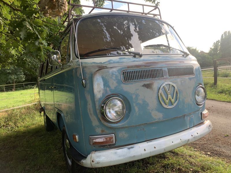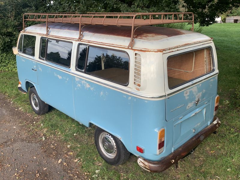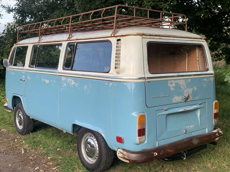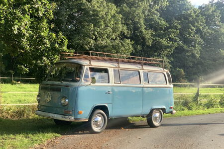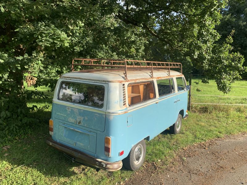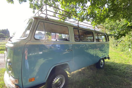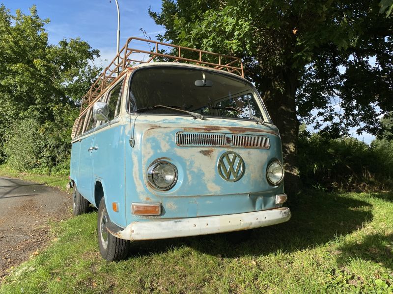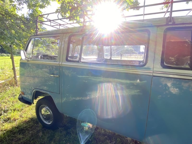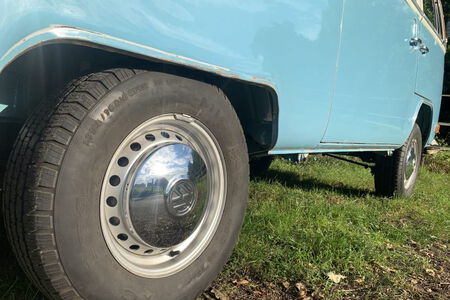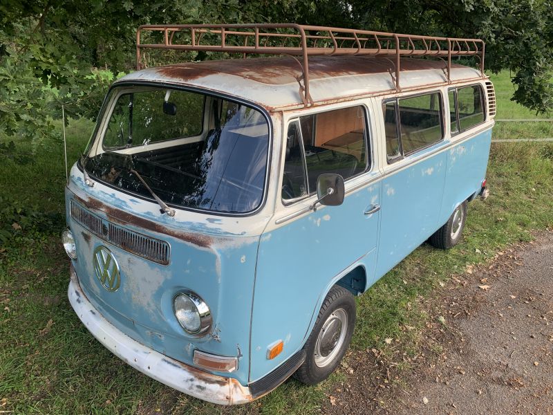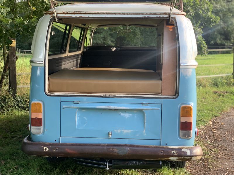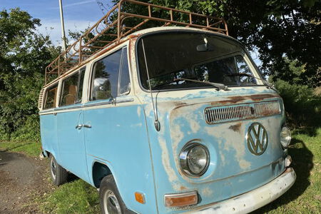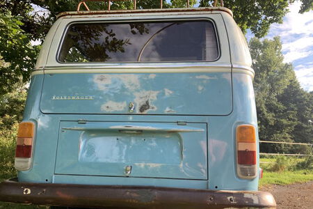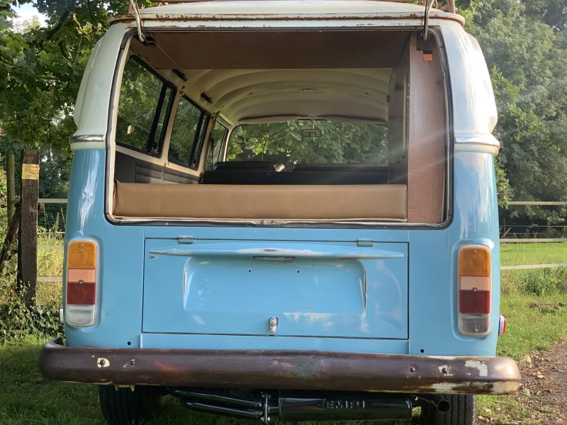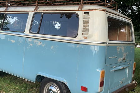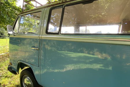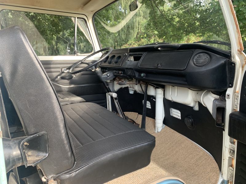 Angeboten wird ein 1972er VW T2ab Deluxe Bus im Erstlack Niagarablau-Pastellweiß mit Westfalia Weekender Ausbau und Schlafbettfunktion.