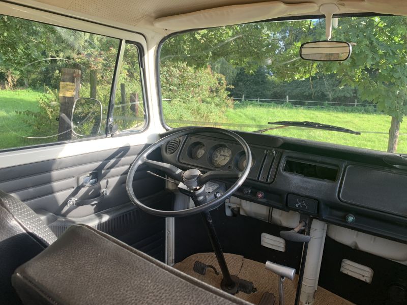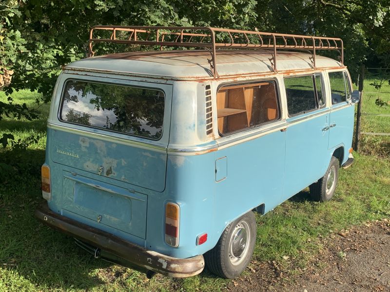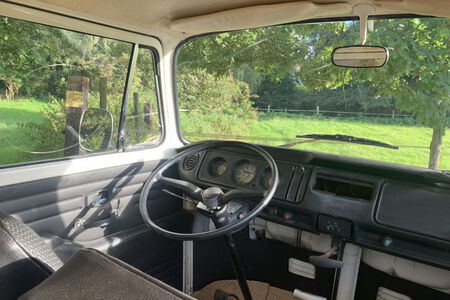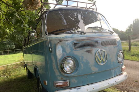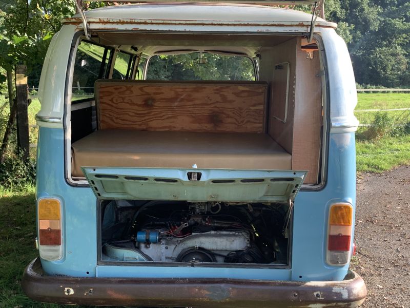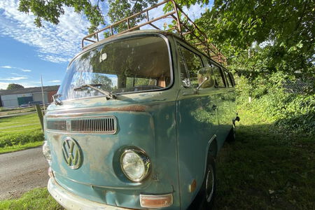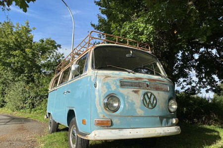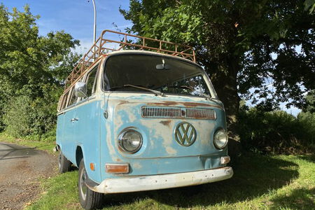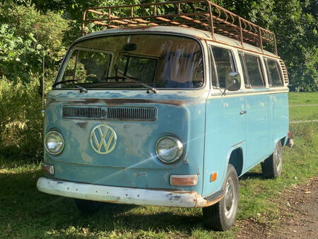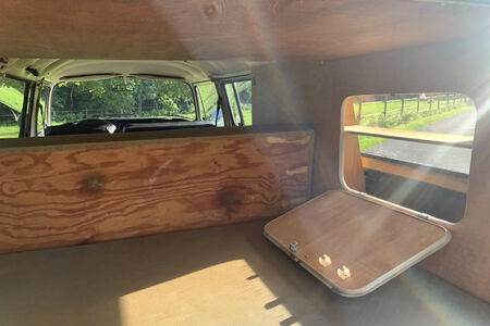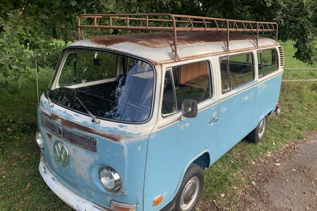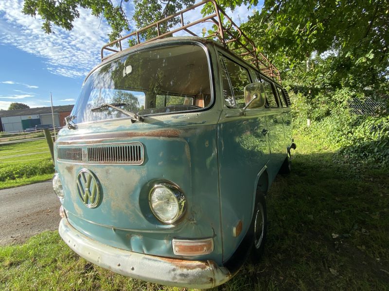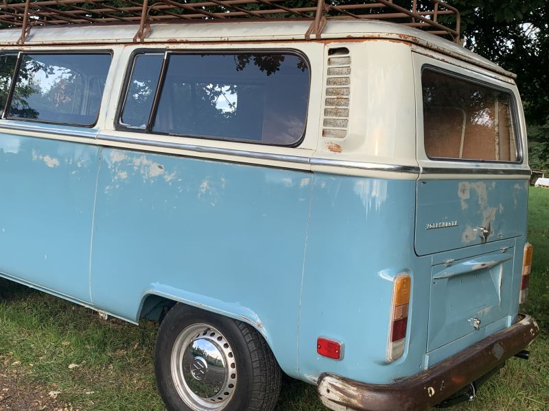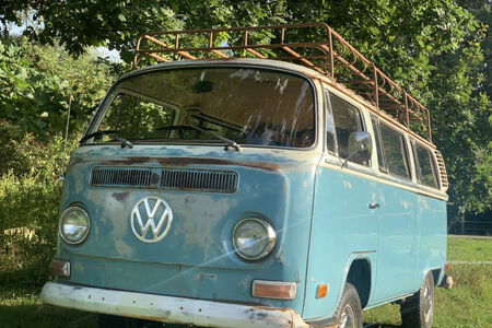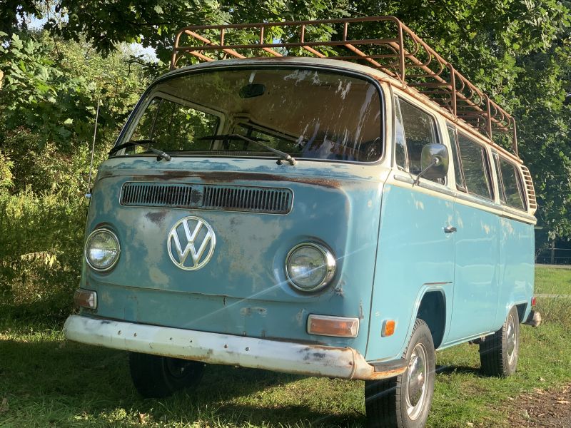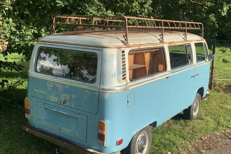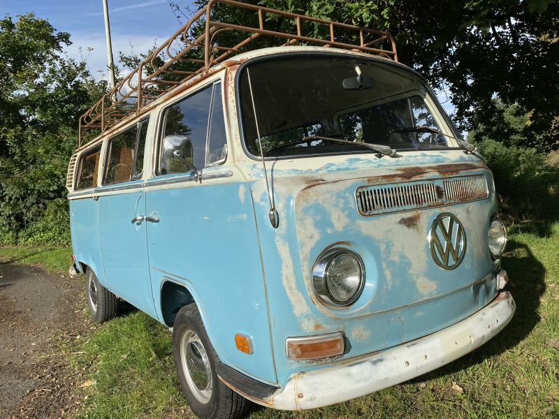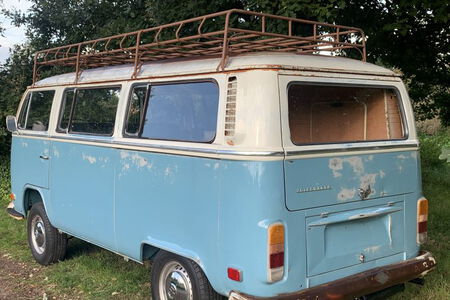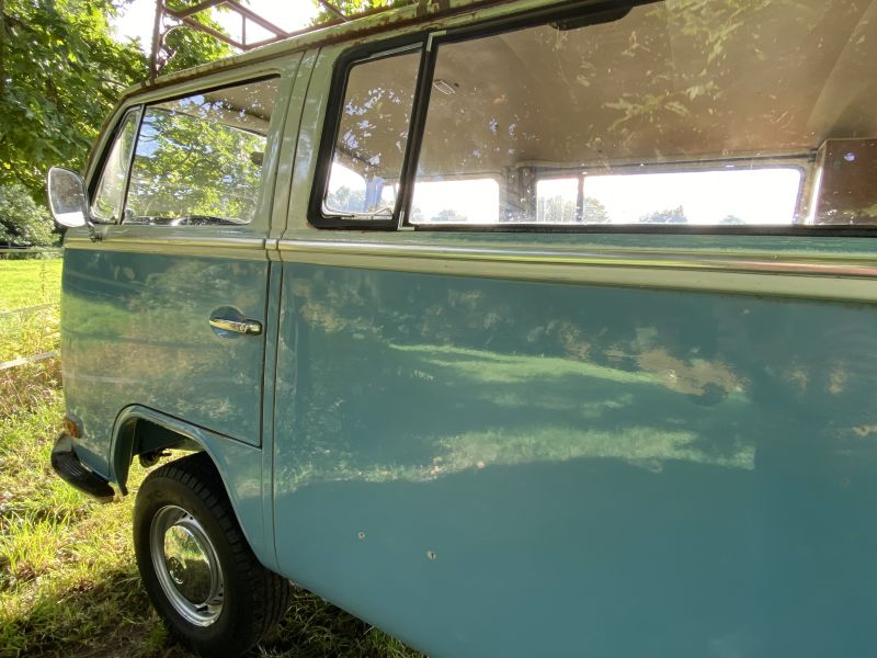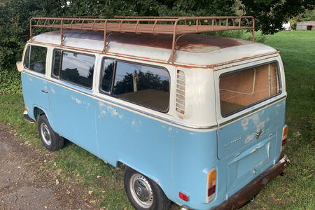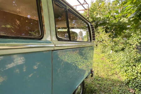 Angeboten wird ein 1972er VW T2ab Deluxe Bus im Erstlack Niagarablau-Pastellweiß mit Westfalia Weekender Ausbau und Schlafbettfunktion.